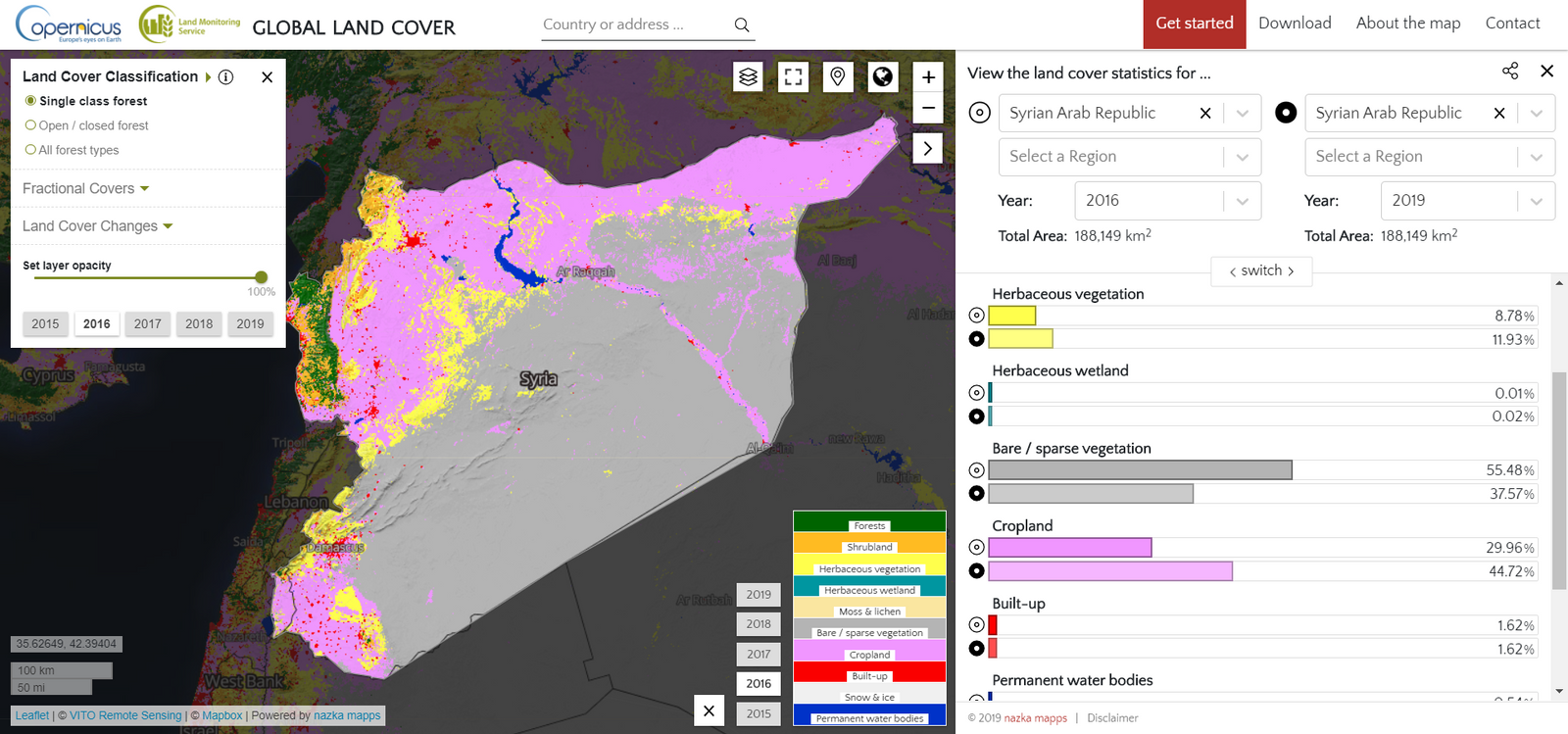 The land cover viewer allows you to download all data for further use. With this new release it is also possible to download individual layers for all years. The land cover viewer is part of the Copernicus Global Land Service, which offers a range of biophysical variables describing the state and evolution of vegetation, energy budget, water cycle and cryosphere over the land surface on a global scale.