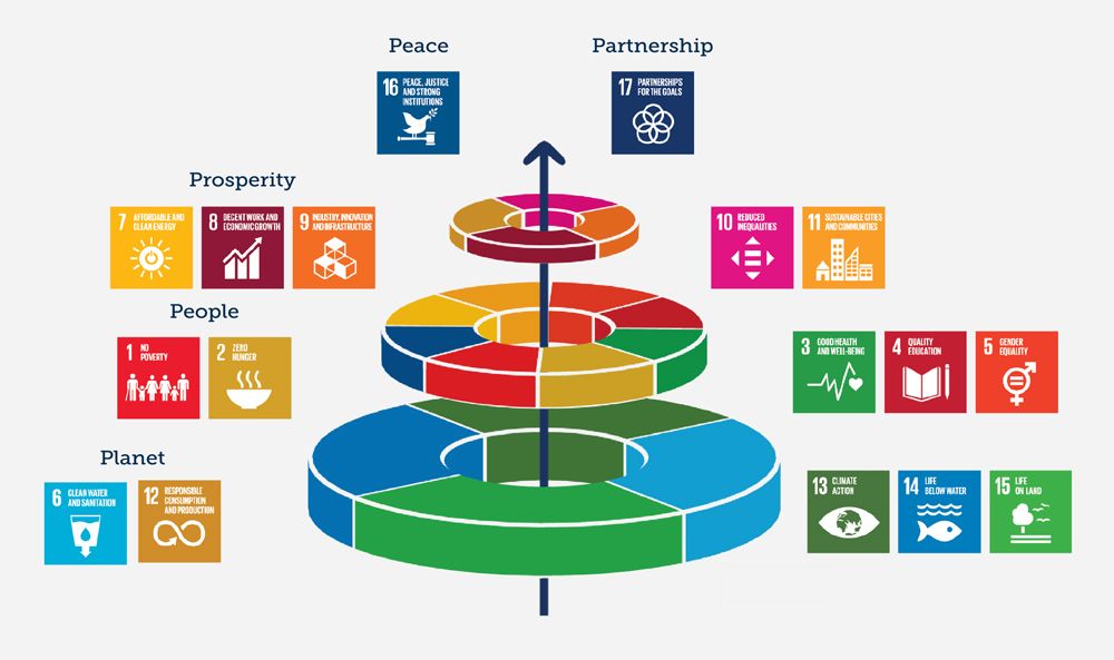 Een handige visuele weergave van deze onderlinge verbondenheid is de "SDG-taart", die de doelen als lagen van een taart afbeeldt en hun geïntegreerde karakter en het fundament dat ze voor elkaar vormen, benadrukt.